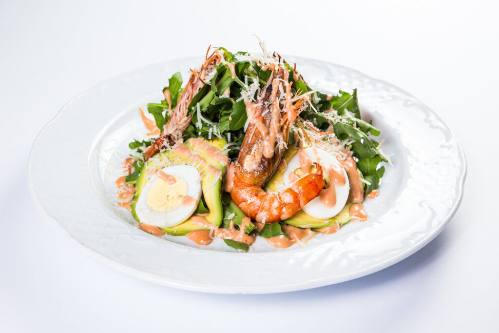 Crisp romaine lettuce, parmesan, and grilled shrimp in creamy Caesar dressing.